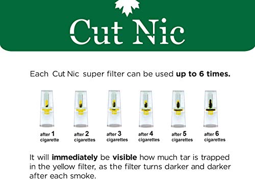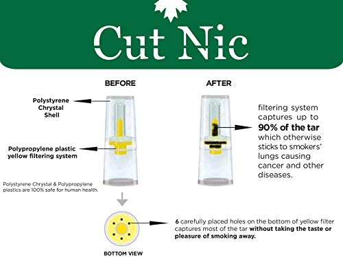 CUT NIC CIGARETTE FILTERS. BEST QUALITY! 100% MONEY-BACK AND 100% SATISFACTION GUARANTEES Blocks almost 90% of the TAR entering your lungs. Does not change the taste of a cigarette. Reduce cough, sore throat, shortness of breath. Minimize stains on teeth and fingers. Polypropylene Plastic is %100 SAFE for human health. ADVANTAGES OF CUT NIC SUPER FILTERS OVER OTHERS The polypropylene plastic bottom hole is made bigger so you can inhale easily. The polypropylene plastic is very solid and long which makes it easy to hold and smoke. Cut-Nic filter is clear-cut so you can see it working from your 1st cigarette. Regular use of Cut Nic Cigarette Filters will reduce your coughing, harsh feeling of throat, soreness of throat caused by smoking. Use it regularly to minimize stains on teeth and fingers. Cut Nic Super Filters does not take away the pleasure of smoking. Cut Nic filter will trap the tar from each cigarette. Use it up to 6 to 8 times until it all the tar is trapped. Use it regularly to minimize stains on teeth and fingers. Use it regularly to reduce cough, harsh feeling and soreness of the throat. Polypropylene Crystal & polypropylene plastics are %100 safe for human health. 6 carefully placed holes on the bottom of the yellow filter captures most of the tar without taking the taste or pleasure of smoking away. TRY AND COMPARE! YOU WILL BE AMAZED!