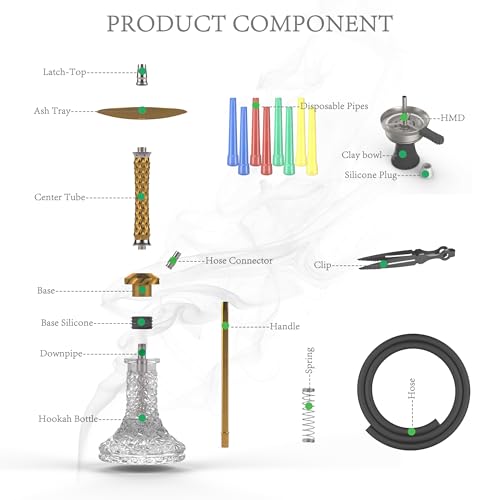 SUITABLE FOR NOVICE BEGINNERS – The complete hookah set includes all accessories: aluminum stem, stainless steel coal holder, ceramic hookah bowl, ash tray, glass bottle, downpipe with diffuser, hose connector, silicone hose and handle.