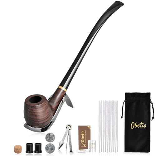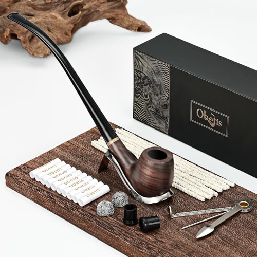 Ebony Tobacco Pipe Set – Elegant Smoking Pipe with High-heel Style Metal Stand, Churchwarden Handmade Pipe Kit with Complete Accessories and Gift Box for Collectors and Beginners